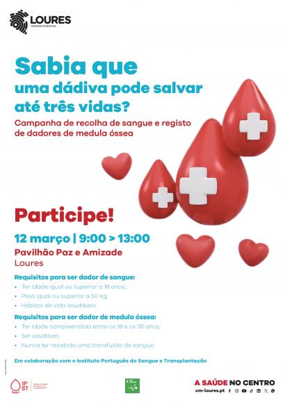 23-FEV-2026Campanha de recolha de sangue e registo de dadores de medula óssea – 2026A Câmara Municipal de Loures, tem realizado várias campanhas de colheitas de Sangue e registo de dadores de Medula Óssea.No dia 12 de março, a Câmara Municipal de Loures, em parceria com o Instituto Português do Sangue e da Transplantação (IPST), vai realizar uma campanha de recolha de sangue e de registo de dadores de medula óssea.A iniciativa vai decorrer entre as 9h00 e as 13h00, no Pavilhão Paz e Amizade, em Loures, e pretende reforçar as reservas de sangue e o número de potenciais dadores de medula óssea, contributos fundamentais para garantir resposta hospitalar a quem dela necessita.A doação de sangue e o registo como dador de medula óssea são procedimentos simples e seguros. Requisitos para ser dador de sangue:- Ter 18 ou mais anos;- Pesar pelo menos 50 kg;- Apresentar hábitos de vida saudáveis. Requisitos para ser dador de medula óssea:- Ter entre 18 e 35 anos;- Ser saudável;- Nunca ter recebido uma transfusão de sangue. Participe nesta iniciativa solidária e contribua para salvar vidas!